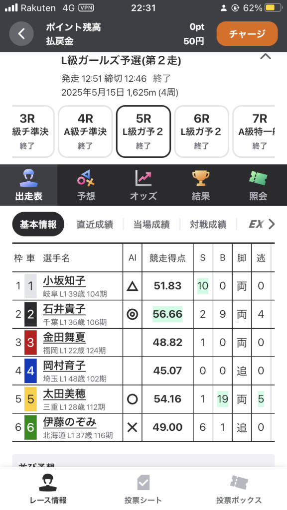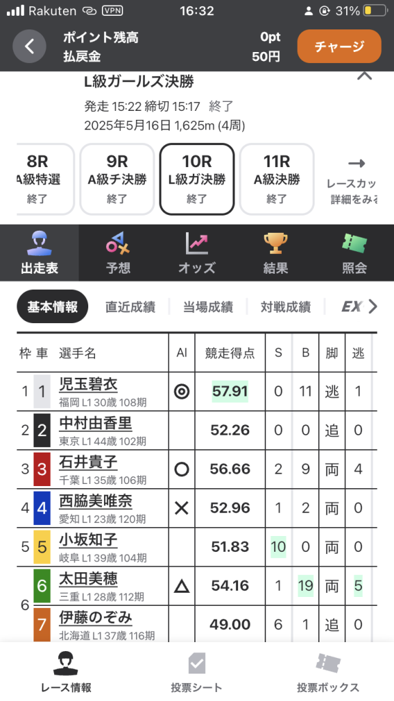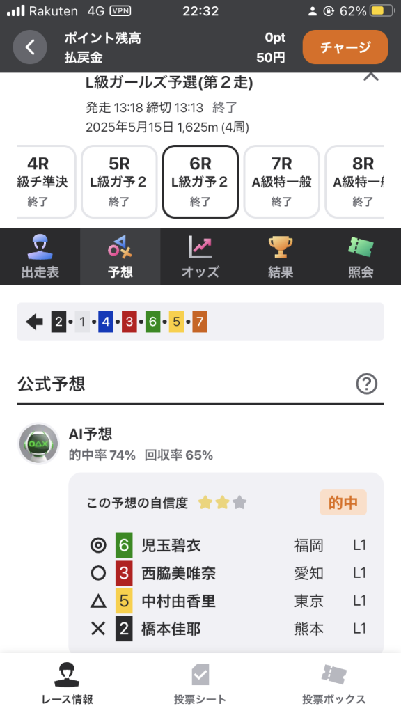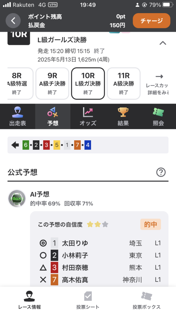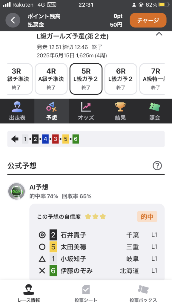 AI予想の自信度★2つですが、1番 児玉選手、3番 石井選手、3番 太田選手の3人による決着が濃厚でしたので投票することにしました。