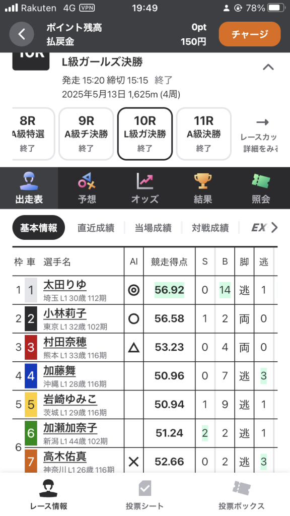 AI予想の自信度【★】2つですが、1番 太田選手、2番 小林選手が1、2着がほぼ確定しているレースでした。