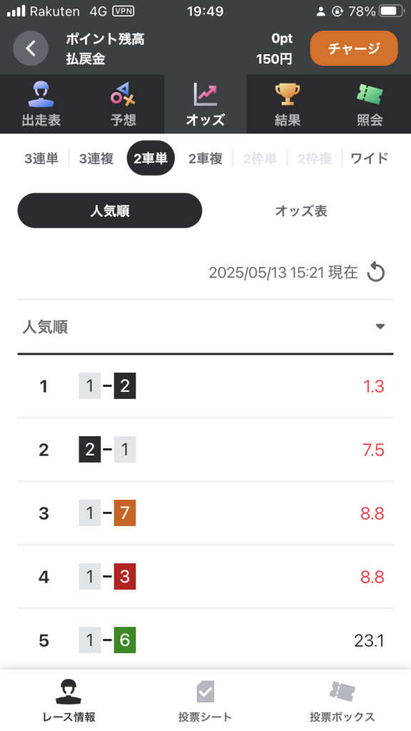 マイルールにより、2車単 1-2オッズ1.3の1点買いとなります。