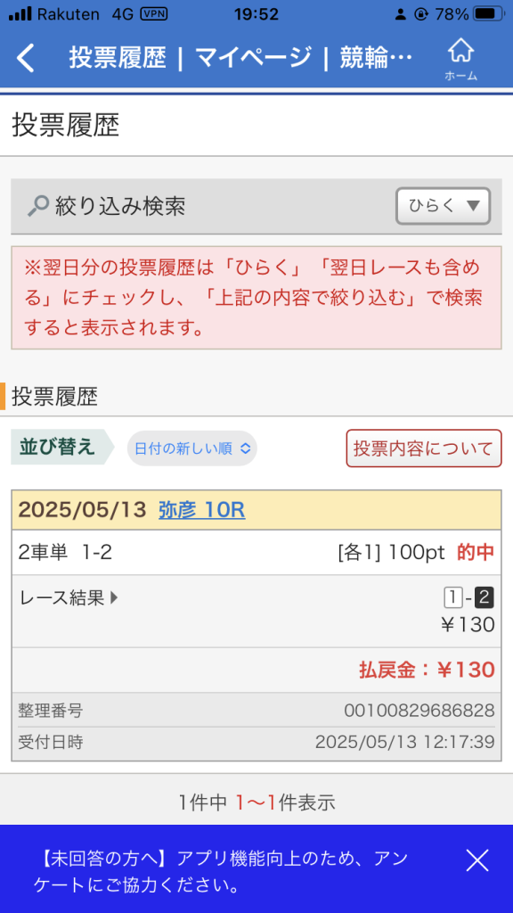 結果は下のようになりました。楽天ポイントだったのでKドリームスから投票しています。