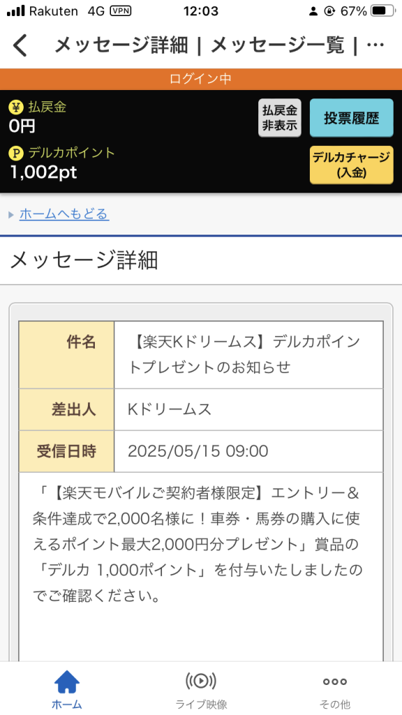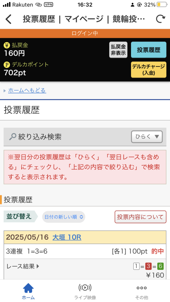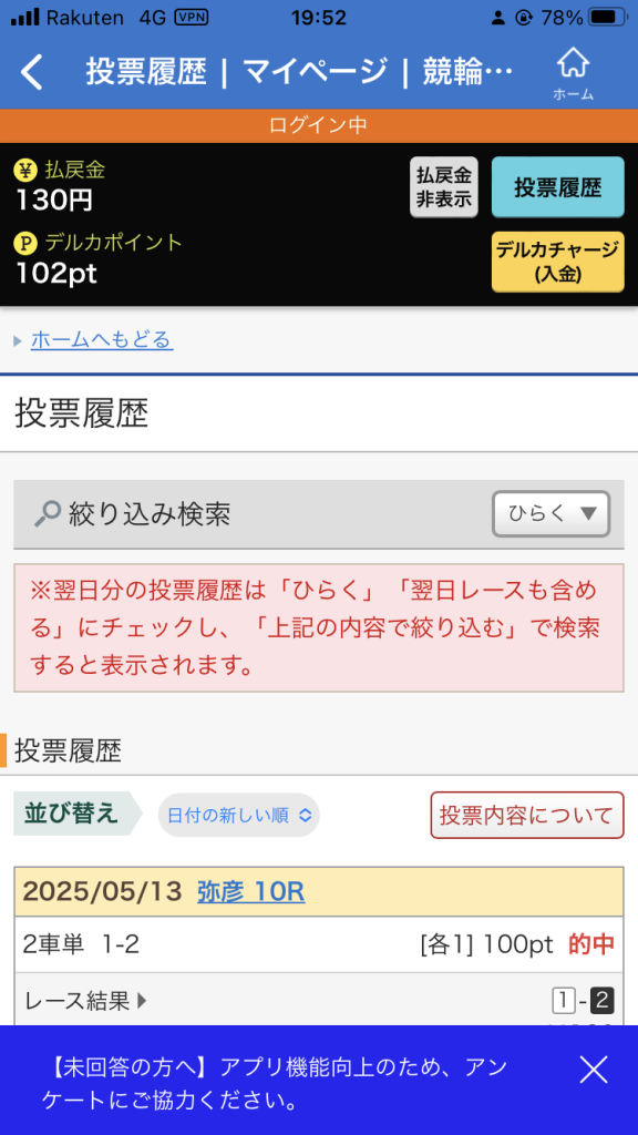 今回は、1000デルカをいただいたものから300デリカで投票したので、払戻金450円がそっくりプラスになります。