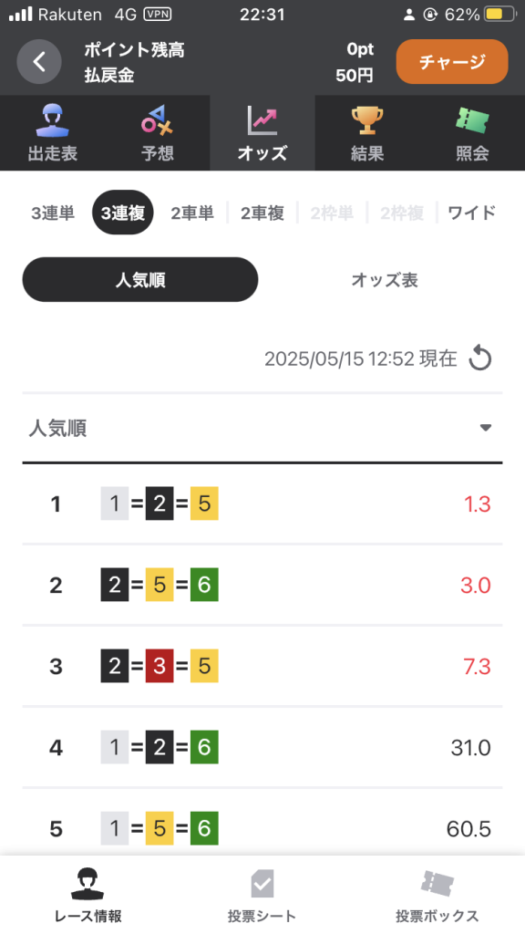 一番無駄のない投票は、3連複1=2=5だと思われますので、3連複1=2=5の1点買いにしました。