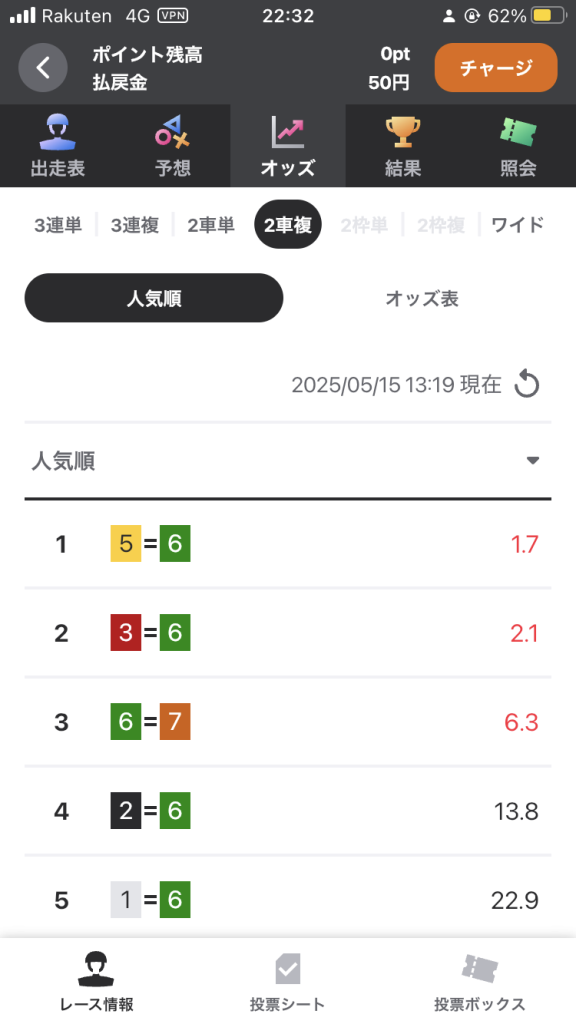 2車複も2車単と同様で投票できません。