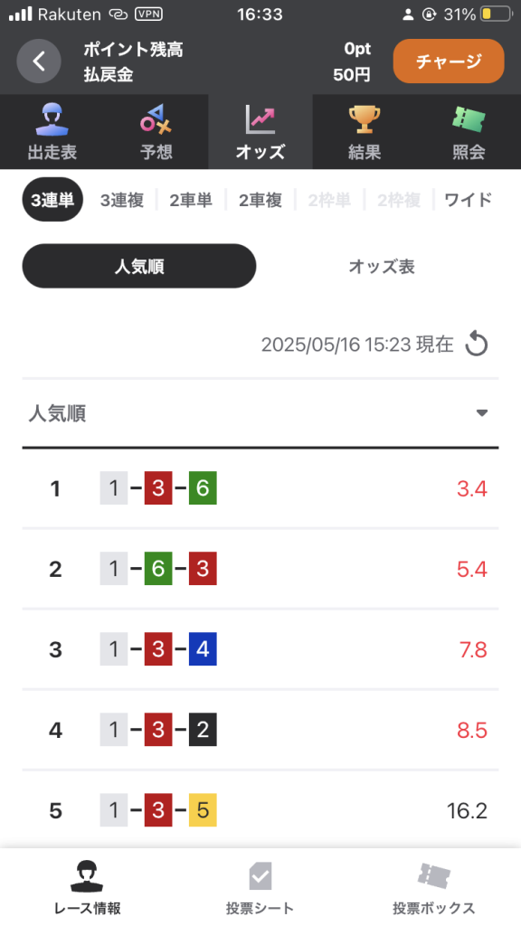 3連複を見てみますと、1=3=6できまりのような感じです。
