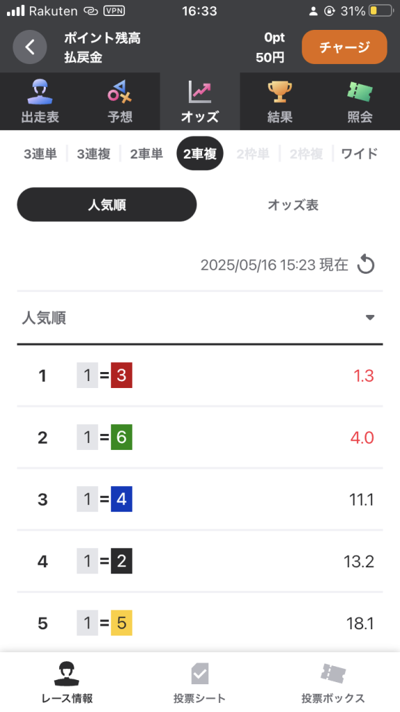 マイルールでは、2点買いまでとなっているので、一番確実な2車単での投票になりました。